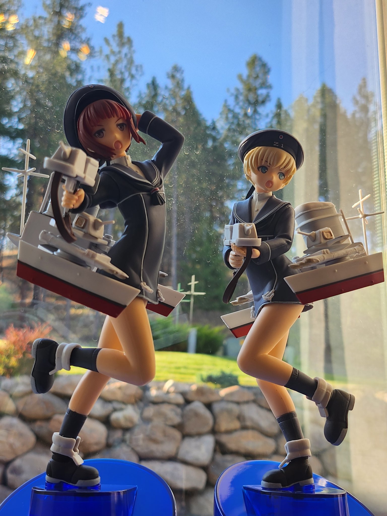This is the first entry to this page. Unfortunately, I don't have a lot to write about today. However, I can share with you some of the figures I just recently bought. They came in the mail right when I began typing this up! These two are from an older gacha game called Kantai Collection or "kancolle" for short. They are shipgirls! To the left you see Z3 (based on the German destroyer-class Z3 Max Schultz), and on the right you can see Z1 (based on the German destroyer-class Z1 Leberecht Maass). Their uniforms and poses are so cute! I really love what I got for the price (about $25 with shipping included). However, there is one small issue that I have with them... Their stands are far too big! They are taller than every single one of my figures and models. I can't find a good reason for their stands to have been designed this way, but maybe I'll replace them with something less obnoxious in the future.
